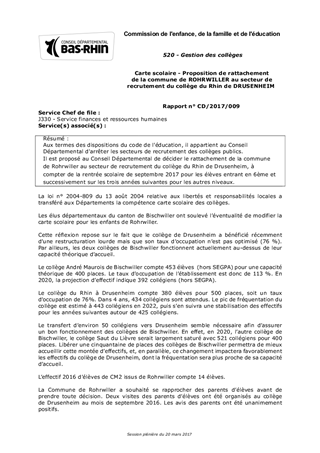 Carte scolaire - Proposition de rattachement de la commune de ROHRWILLER au secteur de recrutement du collège du Rhin de DRUSENHEIM