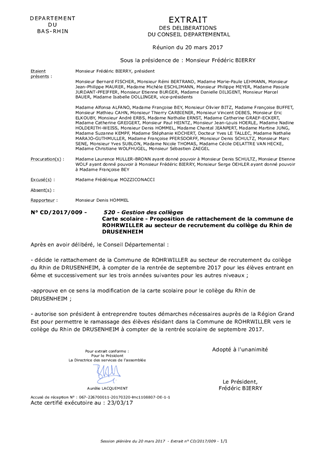 Aux termes des dispositions du code de l'éducation, il appartient au Conseil Départemental d'arrêter les secteurs de recrutement des collèges publics. Il est proposé au Conseil Départemental de décider le rattachement de la commune de Rohrwiller au secteur de recrutement du collège du Rhin de Drusenheim, à compter de la rentrée scolaire de septembre 2017 pour les élèves entrant en 6ème et successivement sur les trois années suivantes pour les autres niveaux.
