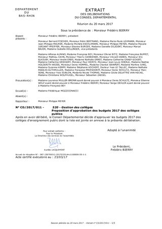 La réglementation budgétaire, financière et comptable applicable aux établissements publics locaux d’enseignement (EPLE) est fondée par l’article L 421-11 du code de l’éducation. Le présent rapport a pour objet de proposer au Conseil Départemental de décider d’approuver les budgets 2017 des collèges publics.