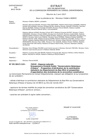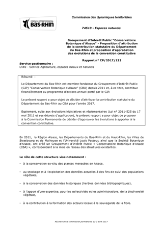 Le Département du Bas-Rhin est membre fondateur du Groupement d'Intérêt Public (GIP) "Conservatoire Botanique d'Alsace" (CBA) depuis 2011 et, à ce titre, contribue financièrement au programme d'actions annuel porté par le GIP. Le présent rapport a pour objet de décider d'attribuer la contribution statutaire du Département du Bas-Rhin au CBA pour l'année 2017. Egalement, suite aux évolutions législatives et réglementaires (Loi n° 2011-525 du 17 mai 2011 et ses décrets d’application), le présent rapport a pour objet de proposer à la Commission Permanente de décider d'approuver les évolutions à apporter à la convention constitutive.