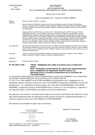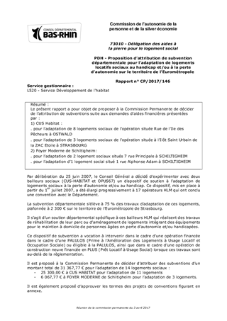 Le présent rapport a pour objet de proposer à la Commission Permanente de décider de l’attribution de subventions suite aux demandes d’aides financières présentées par : 1) CUS Habitat : . pour l’adaptation de 8 logements sociaux de l’opération située Rue de l’Ile des Pêcheurs à OSTWALD . pour l’adaptation de 3 logements sociaux de l’opération située à l’Ilôt Saint Urbain de la ZAC Etoile à STRASBOURG 2) Foyer Moderne de Schiltigheim: . pour l’adaptation de 2 logement sociaux situés 7 rue Principale à SCHILTIGHEIM . pour l’adaptation d’1 logement social situé 1 rue Alphonse Adam à SCHILTIGHEIM