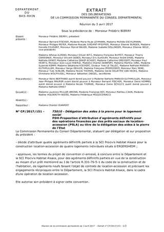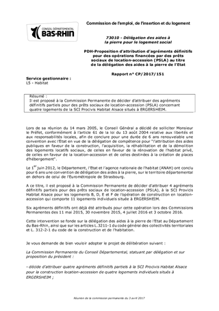 Il est proposé à la Commission Permanente de décider d’attribuer des agréments définitifs partiels pour des prêts sociaux de location-accession (PSLA) concernant quatre logements de la SCI Procivis Habitat Alsace situés à ERGERSHEIM.