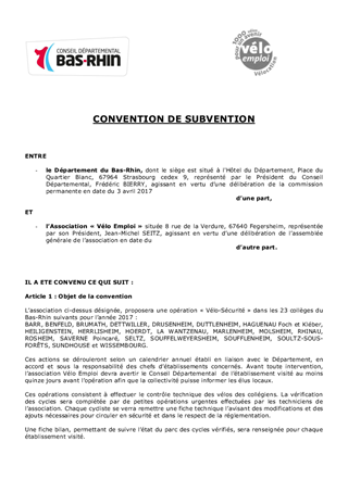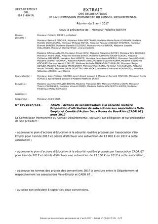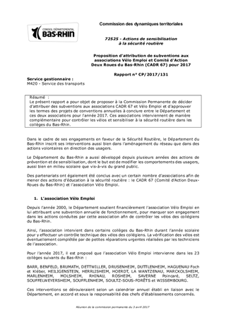 Le présent rapport a pour objet de proposer à la Commission Permanente de décider d'attribuer des subventions aux associations CADR 67 et Vélo Emploi et d'approuver les termes des projets de conventions annuelles à conclure entre le Département et ces deux associations pour l'année 2017. Ces associations interviennent de manière complémentaire pour contrôler les vélos et sensibiliser à la sécurité routière dans les collèges du Bas-Rhin.