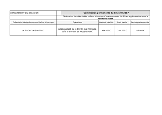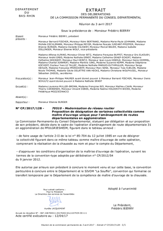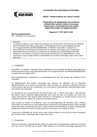 Le présent rapport a pour objet de proposer à la Commission Permanente de désigner comme maître d’ouvrage unique pour l’aménagement de la route départementale 31 en agglomération de PFULGRIESHEIM, le SIVOM "La Souffel", chargé à ce titre d’exercer les attributions relevant de la maîtrise d’ouvrage pour la chaussée départementale concernée, et à autoriser le président du Conseil Départemental à signer la convention à conclure entre cette collectivité et le Département. Cette convention a pour objet d'acter la désignation du maître d’ouvrage unique pour cette opération.