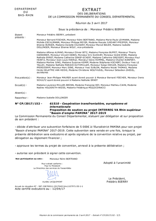 Il est proposé à la Commission Permanente de décider de soutenir le projet "Bassin d'emploi PAMINA" porté par l'Eurodistrict PAMINA. Ce projet transfrontalier, cofinancé à 50% par des crédits européens, dans le cadre du programme INTERREG VA Rhin supérieur, doit, en effet, contribuer à l'amélioration de la situation de l'emploi transfrontalier dans le Nord de l'Alsace et sur le territoire de l'Eurodistrict. Dans ce cadre, le rapport propose à la Commission Permanente de décider de l'attribution d'une subvention forfaitaire de 5 000 € à l'Eurodistrict PAMINA pour la mise en œuvre du projet.