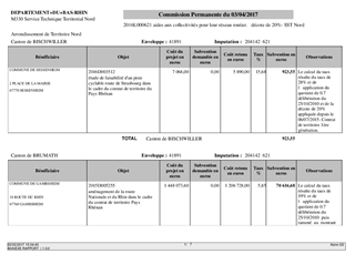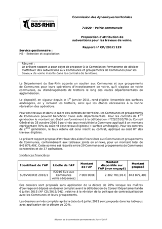 Le présent rapport a pour objet de proposer à la Commission Permanente de décider d’attribuer des subventions aux Communes et groupements de Communes pour les travaux de voirie inscrits dans les contrats de territoire.