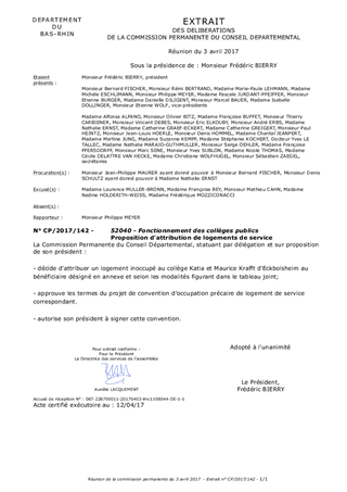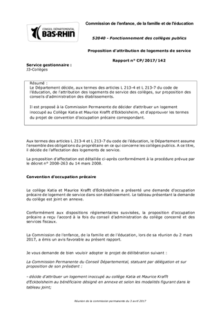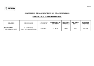 Le Département décide, aux termes des articles L 213-4 et L 213-7 du code de l'éducation, de l'attribution des logements de service des collèges, sur proposition des conseils d'administration des établissements. Il est proposé à la Commission Permanente de décider d'attribuer un logement inoccupé au Collège Katia et Maurice Krafft d'Eckbolsheim, et d'approuver les termes du projet de convention d'occupation précaire correspondant.