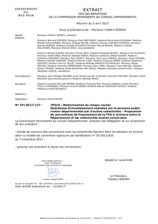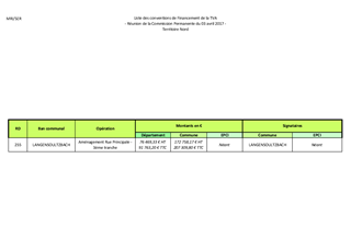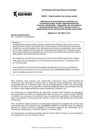 Le Département peut autoriser d’autres collectivités à effectuer des travaux sur son domaine public routier. Ces collectivités, Communes ou Communautés de communes en général, peuvent bénéficier des attributions du fonds de compensation pour la taxe sur la valeur ajoutée (FCTVA) pour les investissements réalisés sur le domaine public d’une autre collectivité à condition de conclure une convention telle que prévue par le Code général des collectivités territoriales. Les projets de conventions à conclure à ce titre ont été établis à partir d’un modèle-type approuvé par délibération de la Commission Permanente du 7 novembre 2011 (n° CP/2011/825). Il est proposé à la Commission Permanente de décider de conclure les projets de convention de financement avec les Communes de LANGENSOULTZBACH et ALTORF selon les tableaux figurant en annexe.