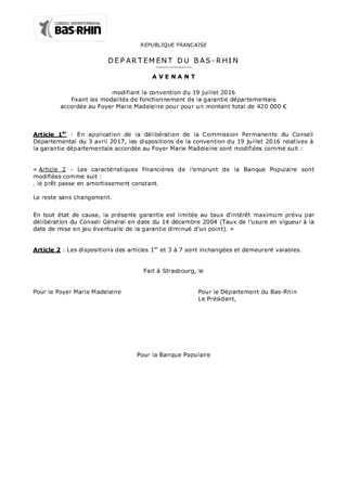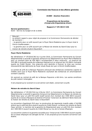 Le présent rapport a pour objet de proposer à la Commission Permanente de décider de maintenir : - la garantie pour un prêt souscrit par le Foyer Marie Madeleine pour le foyer situé à Illkirch Graffenstaden ; - la garantie pour un prêt souscrit par la Maison de retraite du Sacré Cœur pour la maison de retraite située à Dauendorf.