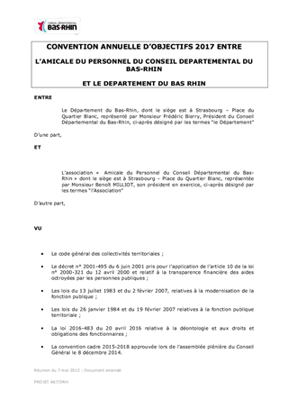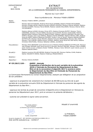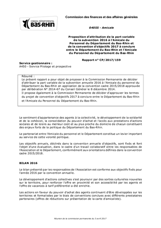 Le présent rapport a pour objet de proposer à la Commission Permanente de décider d'attribuer la part variable de la subvention annuelle 2016 à l’Amicale du personnel du Département du Bas-Rhin en application de la convention cadre 2015/2018 approuvée par délibération N° 2014-67 du Conseil Général le 8 décembre 2014. Il propose également à la Commission Permanente de décider d'approuver les termes du projet de convention d'objectifs 2017 à conclure entre le Département du Bas-Rhin et l'Amicale du Personnel du Département du Bas-Rhin.