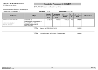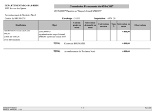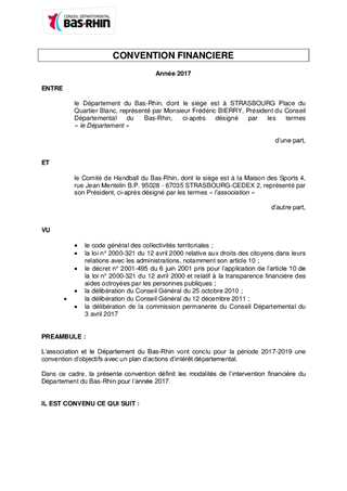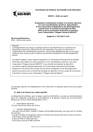 Le Département encourage la pratique sportive des Bas-Rhinois en soutenant les associations sportives, notamment en leur apportant une aide à la licence et à l’organisation de manifestations sportives. Les comités départementaux et les ligues sportives sont soutenus par le biais de conventions d’objectifs et de développement sportif. Le présent rapport a pour objet de proposer à la Commission Permanente de décider d'attribuer des aides à la licence sportive, à une manifestation sportive, ainsi qu'à l'association "Stages Léonard SPECHT" et au Comité de Handball du Bas-Rhin. Le présent rapport propose également à la Commission Permanente de décider d'approuver les termes d'un projet de convention d’objectifs et de développement sportif à conclure avec le Comité de Handball du Bas-Rhin et d'un projet de convention financière à conclure avec l'Association "Stages Léonard Specht".