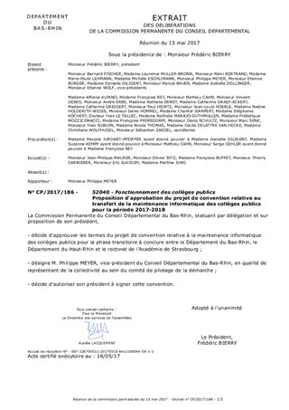 L’article L.213-2 du Code de l’Education modifié par la loi n°2013-595 du 8 Juillet 2013 sur la refondation de l’Ecole de la République (dite loi Peillon) impose la prise en charge de la maintenance matérielle et logicielle par les Départements. Cette maintenance comprend l’acquisition, la mise en service, le maintien et le renouvellement des matériels et des logiciels pour les infrastructures et les équipements. Les Départements du Bas-Rhin et du Haut-Rhin ainsi que le Rectorat de l’académie de Strasbourg ont souhaité coordonner leurs actions pour la période transitoire 2017-2018 à l’issue de laquelle les collectivités auront repris à leur charge l’ensemble de la maintenance informatique. Il est proposé à la Commission Permanente de décider : - d’approuver la poursuite de la reprise progressive de la maintenance informatique des collèges telle que prévue par la loi ; - d’approuver les termes du projet de convention relative à la maintenance informatique des collèges publics pour la phase transitoire à conclure entre le Département du Bas-Rhin, le Département du Haut-Rhin et le Rectorat de l’académie de Strasbourg ; - de désigner M. Philippe Meyer, vice-président du Conseil Départemental en qualité de représentant de la collectivité au sein du comité de pilotage de la démarche ; - d’autoriser son président à signer cette convention.