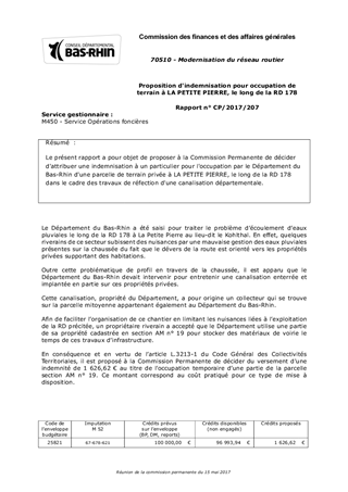 Le présent rapport a pour objet de proposer à la Commission Permanente de décider d'attribuer une indemnisation à un particulier pour l'occupation par le Département du Bas-Rhin d'une parcelle de terrain privée à LA PETITE PIERRE, le long de la RD 178 dans le cadre des travaux de réfection d'une canalisation départementale.