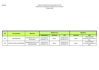 Le Département peut autoriser d’autres collectivités à effectuer des travaux sur son domaine public routier. Ces collectivités, Communes ou Communautés de communes en général, peuvent bénéficier des attributions du fonds de compensation pour la taxe sur la valeur ajoutée (FCTVA) pour les investissements réalisés sur le domaine public d’une autre collectivité à condition de conclure une convention telle que prévue par le Code général des collectivités territoriales. Les projets de conventions à conclure à ce titre ont été établis à partir d’un modèle-type approuvé par délibération de la Commission Permanente du 7 novembre 2011 (n° CP/2011/825). Il est proposé à la Commission Permanente de décider de conclure les projets de convention de financement avec la Communauté de communes de la Plaine du Rhin, selon le tableau figurant en annexe.