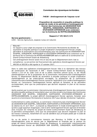 Ce rapport a pour objet de proposer à la Commission Permanente de décider de soumettre à enquête publique le projet d'opération d’aménagement foncier (mode, périmètre et prescriptions environnementales) pour les Communes de GRIESHEIM SUR SOUFFEL, DINGSHEIM, HURTIGHEIM et STUTZHEIM-OFFENHEIM avec extension sur le territoire de la Commune de MITTELHAUSBERGEN dans le cadre de la construction du Grand Contournement Ouest de Strasbourg. Cet aménagement foncier serait mis en œuvre par le Département dont c'est la compétence. La convention de financement des opérations d'aménagement foncier par ARCOS et SOCOS a été signée le 17 octobre 2017.