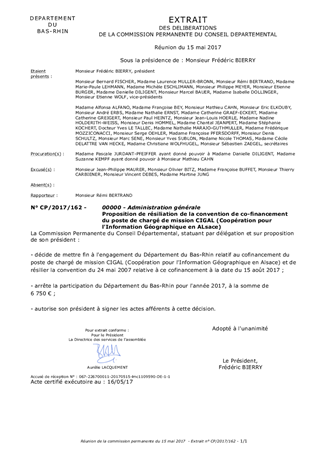 En vertu de la loi n° 2015-991 du 7 août 2015 portant nouvelle organisation territoriale de la République, dite « loi NOTRe », qui confie aux Régions de nouvelles responsabilités en matière d’information géographique, la Coopération pour l’Information Géographique en ALsace (CIGAL) évolue vers un partenariat à l'échelle du Grand Est. Celui-ci est en cours de définition. Dans ce cadre, il est proposé que la répartition du co-financement du poste de chargé de mission CIGAL soit également rediscutée entre partenaires. Lors de la réunion du comité de pilotage CIGAL du 3 mars 2017, les 3 co-financeurs de ce poste, que sont le Département du Bas-Rhin, le Département du Haut-Rhin et la Région, se sont coordonnés pour proposer à leur instance respective la résiliation de la convention fixant les modalités actuelles de cofinancement de ce poste.