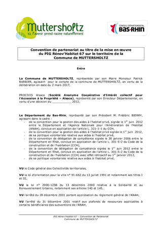 Le présent rapport a pour objet de proposer à la Commission Permanente de décider de mettre en place un partenariat pour la mise en œuvre du Programme d'Intérêt Général (PIG) Rénov'Habitat 67 sur le territoire de la Commune de MUTTERSHOLTZ et un autre partenariat avec la Communauté d'Agglomération de HAGUENAU sur le territoire de l'ancienne Communauté de Communes de BISCHWILLER.