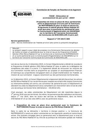 Proposition de mise en place de deux partenariats entre le Département et d'une part la Commune de MUTTERSHOLTZ pour la mise en œuvre du Programme d'intérêt général Rénov'Habitat 67 ainsi que pour la poursuite du partenariat avec la Communauté d'Agglomération de HAGUENAU sur le territoire de l'ancienne Communauté de Communes de BISCHWILLER d'autre part
