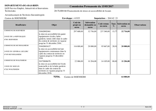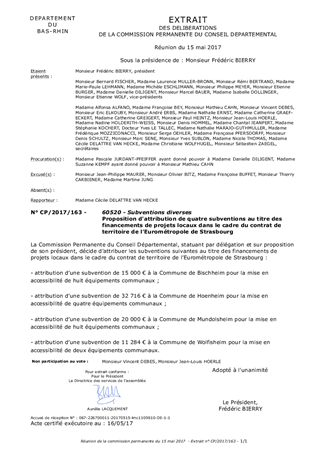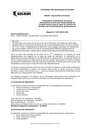En application du contrat de territoire de l'Eurométropole de Strasbourg 2015-2016 approuvé par la Commission Permanente du Conseil Départemental lors de sa réunion du 4 Avril 2016, le Département du Bas-Rhin s'est engagé à participer au financement de quatre projets, relatifs à la mise en accessibilité de différents équipements et bâtiments communaux, inscrits dans l’annexe financière du contrat de territoire.