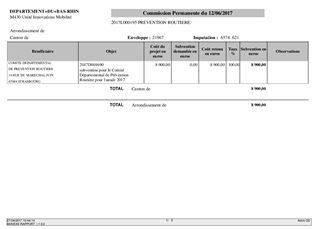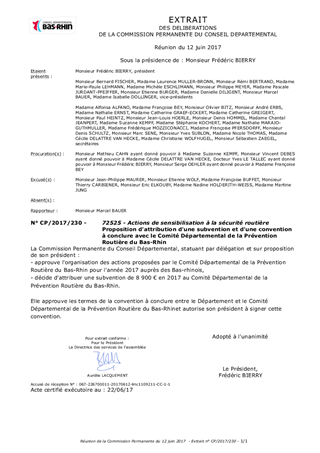 Le présent rapport propose à la Commission Permanente de décider de conclure une convention annuelle entre le Département et le Comité Départemental de la Prévention Routière du Bas-Rhin, pour l'année 2017. Le Comité intervient pour des actions de sensibilisation des Bas-Rhinois à la sécurité routière et des déplacements. Le rapport propose également à la Commission Permanente de décider de l'attribution d'une subvention d'un montant de 8 900 € au Comité pour mener les actions prévues en 2017.