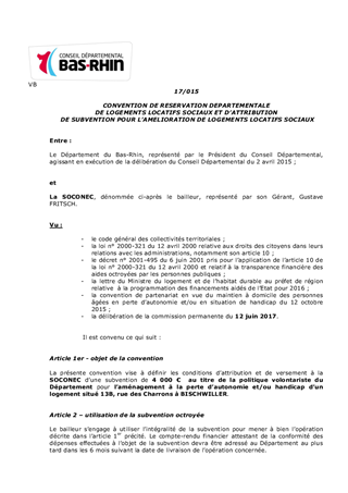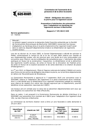 Le présent rapport concerne la demande d’aide financière présentée par la Société de Constructions Economiques de Bischwiller (SOCONEC) concernant les travaux d’adaptation au handicap et/ou à la perte d’autonomie d’un logement locatif social dans le cadre du dispositif départemental d’aide à la réhabilitation de logements locatifs sociaux.