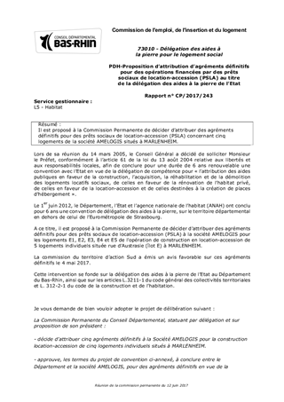 Il est proposé à la Commission Permanente de décider d’attribuer des agréments définitifs pour des prêts sociaux de location-accession (PSLA) concernant cinq logements de la société AMELOGIS situés à MARLENHEIM.