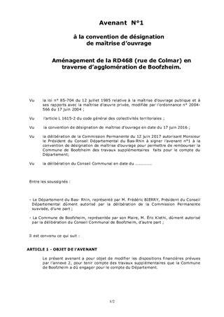 Proposition d’avenant à la convention de désignation de maîtrise d’ouvrage pour prendre en compte le dépassement du coût des travaux d’aménagement de la RD468 (rue de Colmar) en traverse d’agglomération réalisés par la Commune de BOOFZHEIM