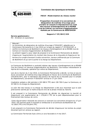 La convention de désignation de maîtrise d’ouvrage n°2016/057, adoptée par la Commission Permanente le 2 mai 2016 sur la base du rapport n° CP/2016/187, a confié à la Commune de Boofzheim les travaux d’aménagement de la RD468 (rue de Colmar) en traverse d’agglomération de Boofzheim. Le présent rapport a pour objet de proposer à la Commission Permanente de décider d'approuver l’augmentation du montant des travaux de la chaussée et d’approuver les termes d’un projet d’avenant à cette convention, travaux préfinancés par la Commune de Boofzheim et qui sont à porter à la charge du Département.