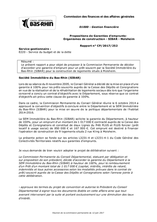 Le présent rapport a pour objet de proposer à la Commission Permanente de décider d’accorder une garantie d’emprunt pour un prêt souscrit par la Société Immobilière du Bas-Rhin (SIBAR) pour la construction de logements situés à Molsheim.