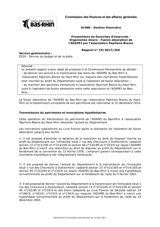 Le présent rapport a pour objet de proposer à la Commission Permanente de décider : - de donner son accord à la transmission des biens de l’ADAPEI du Bas-Rhin à l’association Papillons Blancs du Haut-Rhin sur lesquels des inscriptions hypothécaires sont inscrites au profit du Département suite à l’opération de fusion absorption ; - du maintien des garanties d’emprunts à l’association Papillons Blancs du Haut-Rhin suite à l’opération de fusion absorption entre cette association et l’ADAPEI du Bas-Rhin.