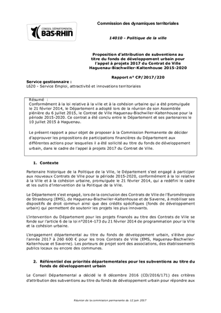 Conformément à la loi relative à la ville et à la cohésion urbaine qui a été promulguée le 21 février 2014, le Département a adopté lors de la réunion de son Assemblée plénière du 6 juillet 2015, le Contrat de Ville Haguenau-Bischwiller-Kaltenhouse pour la période 2015-2020. Ce contrat a été conclu entre le Département et ses partenaires le 10 juillet 2015 à Haguenau. Le présent rapport a pour objet de proposer à la Commission Permanente de décider d'approuver les propositions de participations financières du Département aux différentes actions pour lesquelles il a été sollicité au titre du fonds de développement urbain, dans le cadre de l'appel à projets 2017 du Contrat de Ville.