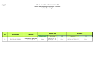 Le Département peut autoriser d’autres collectivités à effectuer des travaux sur son domaine public routier. Ces collectivités, Communes ou Communautés de communes en général, peuvent bénéficier des attributions du fonds de compensation pour la taxe sur la valeur ajoutée (FCTVA) pour les investissements réalisés sur le domaine public d’une autre collectivité à condition de conclure une convention telle que prévue par le Code général des collectivités territoriales. Les projets de conventions à conclure à ce titre ont été établis à partir d’un modèle-type approuvé par délibération de la Commission Permanente du 7 novembre 2011 (n° CP/2011/825). Il est proposé à la Commission Permanente de décider de conclure les projets de convention de financement avec la Commune d'Oberschaeffolsheim et la Communauté d'Agglomération de Haguenau, selon les tableaux figurants en annexe.