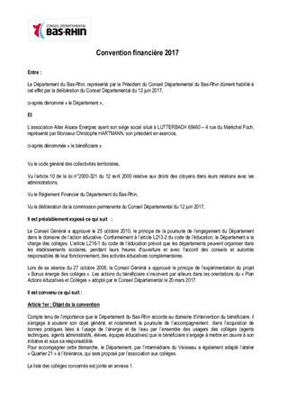 Le présent rapport propose à la Commission Permanente de décider d'attribuer une subvention à l'association Alter Alsace Energies pour l'accompagnement de la démarche "Bonus Energie dans les collèges".