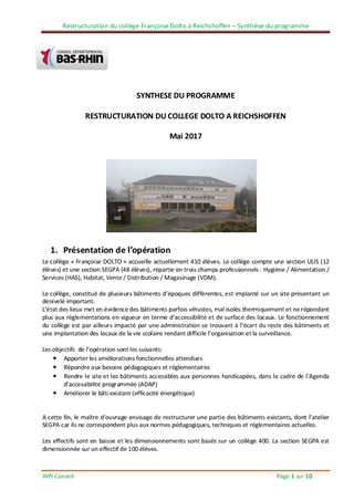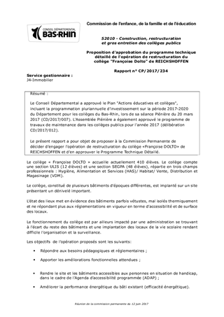 Le Conseil Départemental a approuvé le Plan "Actions éducatives et collèges", incluant la programmation pluriannuelle d'investissement sur la période 2017-2020 du Département pour les collèges du Bas-Rhin, lors de sa séance Plénière du 20 mars 2017 (CD/2017/007). L'Assemblée Plénière a également approuvé le programme de travaux de maintenance dans les collèges publics pour l'année 2017 (délibération CD/2017/012). Le présent rapport a pour objet de proposer à la Commission Permanente de décider d’engager l’opération de restructuration du collège «Françoise DOLTO» de REICHSHOFFEN et d’en approuver le Programme Technique Détaillé.