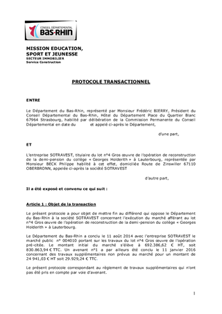 Dans le cadre de l’opération de reconstruction de la demi-pension du collège « Georges Holderith » à LAUTERBOURG la société SOTRAVEST, titulaire du lot n°4 Gros œuvre, sollicite du Département dans un mémoire en réclamation la prise en charge du coût de surconsommation d’acier dans les structures en béton armé. Il est proposé à la Commission Permanente de décider d'approuver la prise en charge par le Département du Bas-Rhin d'une indemnité transactionnelle au bénéfice de l'entreprise SOTRAVEST et d'approuver les termes du projet de protocole transactionnel à conclure avec l'entreprise SOTRAVEST.