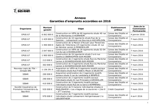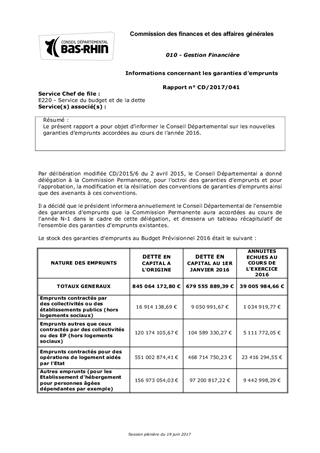 Le présent rapport a pour objet d’informer le Conseil Départemental sur les nouvelles garanties d’emprunts accordées au cours de l’année 2016.