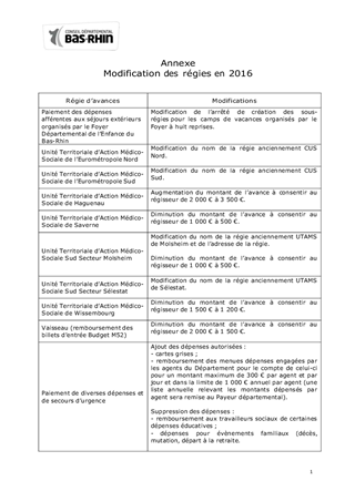 Le présent rapport a pour objet d’informer le Conseil Départemental sur les modifications apportées aux régies d’avances, aux régies de recettes et à la régie d’avances et de recettes au cours de l’année 2016.