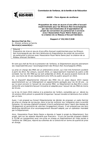 Proposition de mise en œuvre d'une offre d'accueil expérimentale pour les Mineurs Non Accompagnés par des tiers bénévoles et d'approbation du projet de convention de partenariat à conclure avec l'Association Foyer Notre Dame pour la création de ce Réseau d'Accueil Solidaire.