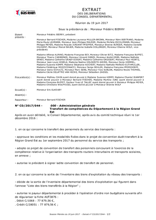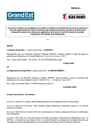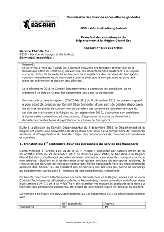 La loi n°2015-991 du 7 août 2015 portant nouvelle organisation territoriale de la République (dite loi «NOTRe») prévoit que les Départements transfèrent à la Région sur le territoire de laquelle ils se trouvent la compétence des services de transports routiers interurbains et du transport scolaire ainsi que la compétence relative aux plans de prévention et gestion des déchets. Le 8 décembre 2016 le Conseil Départemental a approuvé les conditions de ce transfert à la Région Grand Est concernant ces deux compétences. Comme prévu dans le rapport (CD/2016/191) du 8 décembre 2016, le présent rapport a pour objet de proposer au Conseil Départemental, d'une part, de décider d'approuver les termes du projet de convention de transfert des personnels départementaux du service des transports à la Région au 1er septembre 2017, d'autoriser son président à signer cette convention, et d'autre part, d'approuver la sortie de l'inventaire départemental des biens d'exploitation du réseau de transports.