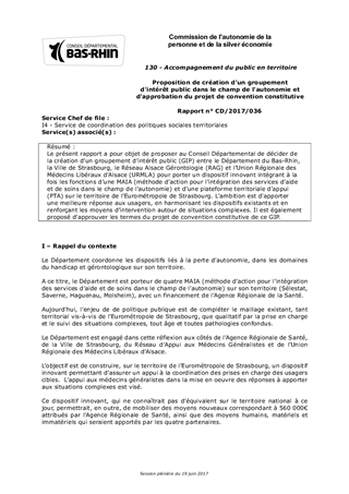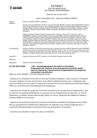Le présent rapport a pour objet de proposer au Conseil Départemental de décider de la création d'un groupement d'intérêt public (GIP) entre le Département du Bas-Rhin, la Ville de Strasbourg, le Réseau Alsace Gérontologie (RAG) et l’Union Régionale des Médecins Libéraux d’Alsace (URMLA) pour porter un dispositif innovant intégrant à la fois les fonctions d’une MAIA (méthode d’action pour l’intégration des services d’aide et de soins dans le champ de l’autonomie) et d’une plateforme territoriale d’appui (PTA) sur le territoire de l’Eurométropole de Strasbourg. L'ambition est d'apporter une meilleure réponse aux usagers, en harmonisant les dispositifs existants et en renforçant les moyens d’intervention autour de situations complexes. Il est également proposé d'approuver les termes du projet de convention constitutive de ce GIP.