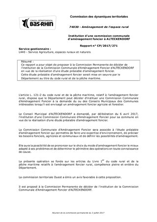 Ce rapport a pour objet de proposer à la Commission Permanente de décider de l’institution de la Commission Communale d’Aménagement Foncier d’ALTECKENDORF en vue de la réalisation d’une étude préalable d’aménagement foncier. Cette étude préalable d'aménagement foncier serait mise en oeuvre par le Département au titre du code rural et de la pêche maritime.