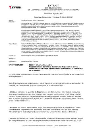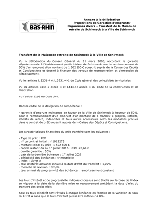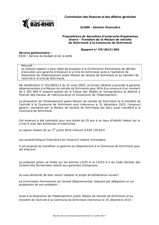 Le présent rapport a pour objet de proposer à la Commission Permanente de décider d’accorder une garantie d’emprunt à la Ville de Schirmeck suite à l’opération de dissolution de l’établissement public Maison de retraite de Schirmeck et au transfert de l’activité à la Ville de Schirmeck.