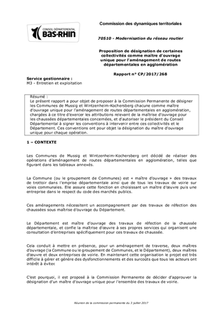 Le présent rapport a pour objet de proposer à la Commission Permanente de désigner les Communes de Mussig et Wintzenheim-Kochersberg chacune comme maître d’ouvrage unique pour l’aménagement de routes départementales en agglomération, chargées à ce titre d’exercer les attributions relevant de la maîtrise d’ouvrage pour les chaussées départementales concernées, et d'autoriser le président du Conseil Départemental à signer les conventions à intervenir entre ces collectivités et le Département. Ces conventions ont pour objet la désignation du maître d’ouvrage unique pour chaque opération.