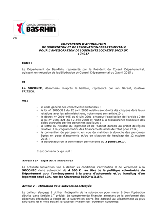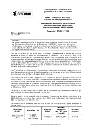 Le présent rapport concerne la demande d’aide financière présentée par la Société de Constructions Economiques de Bischwiller (SOCONEC) concernant les travaux d’adaptation au handicap et/ou à la perte d’autonomie d’un logement locatif social situé à Bischwiller dans le cadre du dispositif départemental d’aide à la réhabilitation de logements locatifs sociaux.