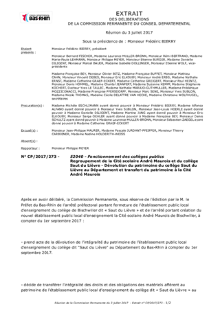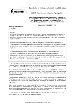 Le Conseil Départemental a approuvé le 20 mars 2017 le principe du regroupement du collège Saut du Lièvre et de la Cité scolaire André Maurois de Bischwiller au sein d’un établissement public local d’enseignement (EPLE) nouvellement créé, avec effet au 1er septembre 2017. En application des dispositions du Code de l'éducation, l'ensemble du patrimoine de l'établissement fermé est dévolu à la collectivité de rattachement, à qui il appartient de se prononcer sur la dévolution des droits et obligations au bénéfice de l'établissement repreneur. Le présent rapport propose à la Commission Permanente de prendre acte des modalités de dévolution du patrimoine du collège Saut du Lièvre au profit du Département du Bas-Rhin, collectivité de rattachement , et de décider du transfert des droits et obligations des matériels afférents au patrimoine à la Cité scolaire André Maurois, à compter du 1er septembre 2017.