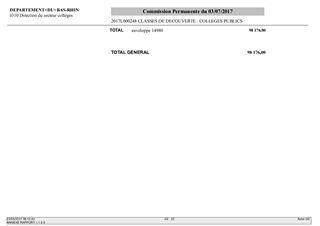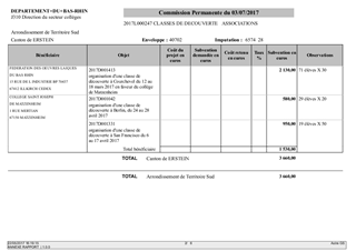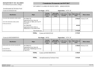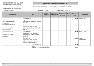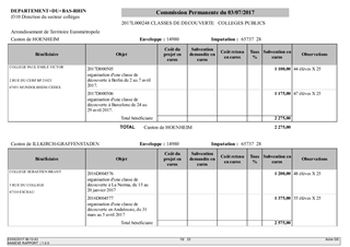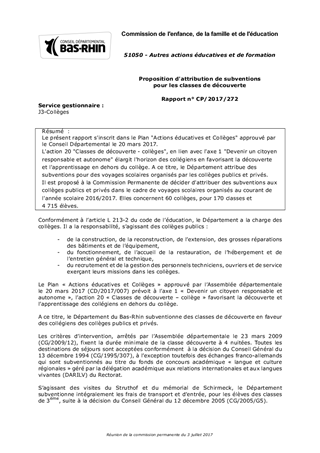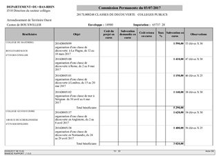 Le présent rapport s'inscrit dans le Plan "Actions éducatives et Collèges" approuvé par le Conseil Départemental le 20 mars 2017. L'action 20 "Classes de découverte - collèges", en lien avec l'axe 1 "Devenir un citoyen responsable et autonome" élargit l'horizon des collégiens en favorisant la découverte et l'apprentissage en dehors du collège. A ce titre, le Département attribue des subventions pour des voyages scolaires organisés par les collèges publics et privés. Il est proposé à la Commission Permanente de décider d'attribuer des subventions aux collèges publics et privés dans le cadre de voyages scolaires organisés au courant de l'année scolaire 2016/2017. Elles concernent 60 collèges, pour 170 classes et 4 715 élèves.