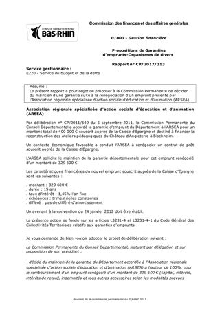 Le présent rapport a pour objet de proposer à la Commission Permanente de décider du maintien d’une garantie suite à la renégociation d’un emprunt présenté par l’Association régionale spécialisée d’action sociale d’éducation et d’animation (ARSEA).