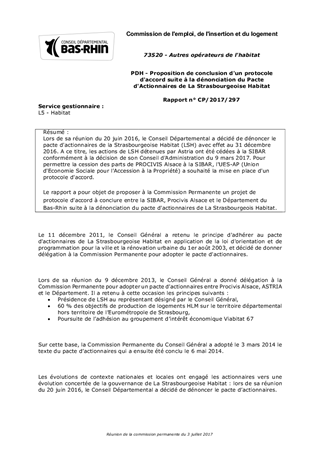 Lors de sa réunion du 20 juin 2016, le Conseil Départemental a décidé de dénoncer le pacte d'actionnaires de la Strasbourgeoise Habitat (LSH) avec effet au 31 décembre 2016. A ce titre, les actions de LSH détenues par Astria ont été cédées à la SIBAR conformément à la décision de son Conseil d'Administration du 9 mars 2017. Pour permettre la cession des parts de PROCIVIS Alsace à la SIBAR, l'UES-AP (Union d'Economie Sociale pour l'Accession à la Propriété) a souhaité la mise en place d'un protocole d'accord. Le rapport a pour objet de proposer à la Commission Permanente un projet de protocole d'accord à conclure entre la SIBAR, Procivis Alsace et le Département du Bas-Rhin suite à la dénonciation du pacte d'actionnaires de La Strasbourgeois Habitat.