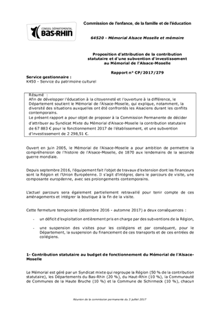 Afin de développer l’éducation à la citoyenneté et l’ouverture à la différence, le Département soutient le Mémorial de l'Alsace-Moselle, qui explique, notamment, la diversité des situations auxquelles ont été confrontés les Alsaciens durant les conflits contemporains. Le présent rapport a pour objet de proposer à la Commission Permanente de décider d'attribuer au Syndicat Mixte du Mémorial d'Alsace-Moselle la contribution statutaire de 67 883 € pour le fonctionnement 2017 de l'établissement, et une subvention d'investissement de 2 298,51 €.