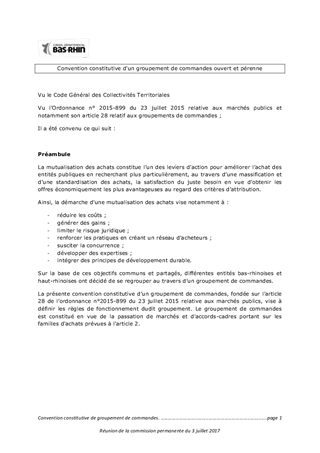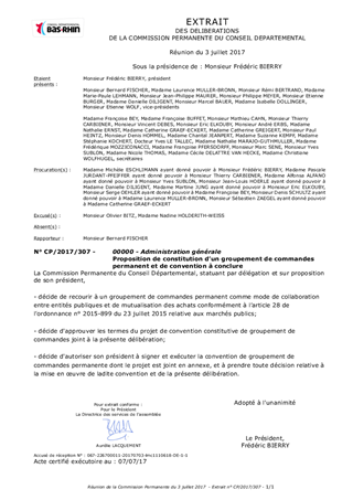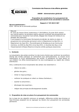 En vertu de l’article 28 de l’ordonnance n° 2015-899 du 23 juillet 2015 relative aux marché publics, les acheteurs publics peuvent constituer des groupements de commandes pour mutualiser leurs achats, dégager des marges de manœuvre ou partager des expertises. Il est proposé à la Commission Permanente de décider de mettre en place un groupement de commandes permanent entre le Département du Bas-Rhin, le Département du Haut-Rhin, l’Eurométropole de Strasbourg et ses Communes membres, les SDIS du Bas-Rhin et du Haut-Rhin, le Syndicat des Eaux et de l’Assainissement d’Alsace-Moselle et d’autres entités publiques alsaciennes.